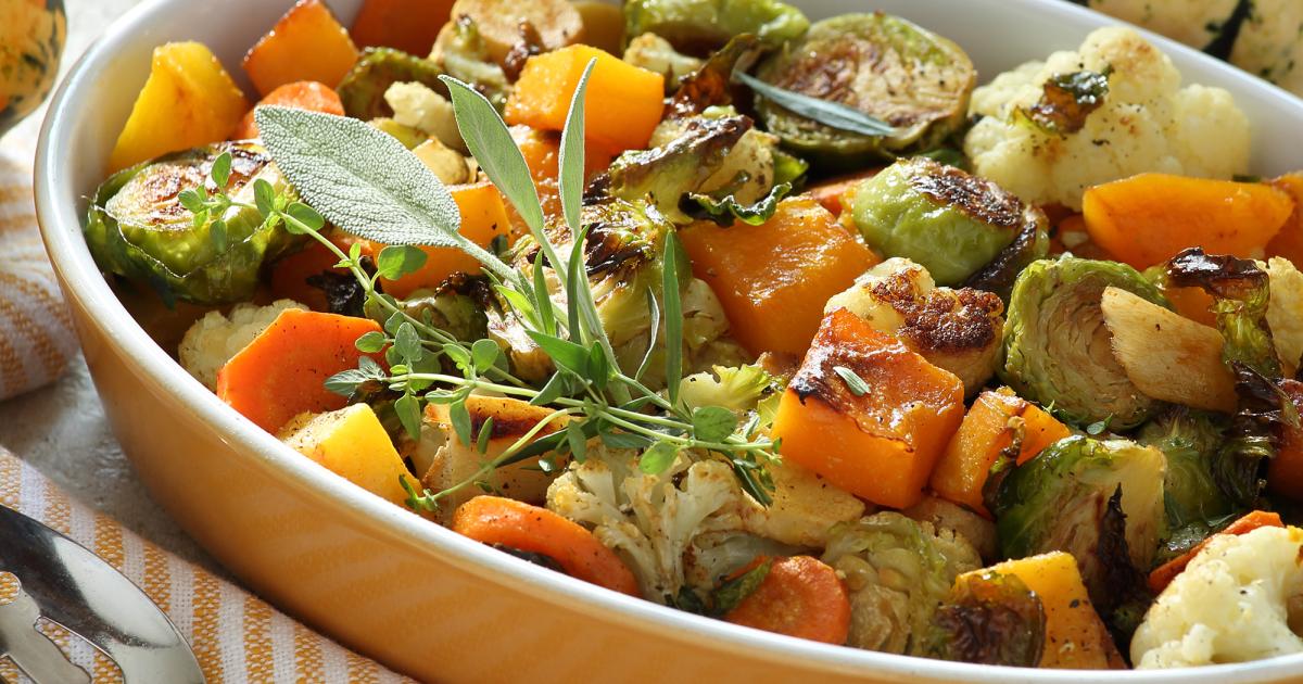 - Roasting Vegetables with Herbs (shown) – This customer favorite contains Brussels sprouts, parsnips, butternut squash, carrots and cauliflower, plus fresh rosemary, sage and thyme. Just toss everything together with the seasoned oil included in the package and roast on a parchment-lined baking sheet.