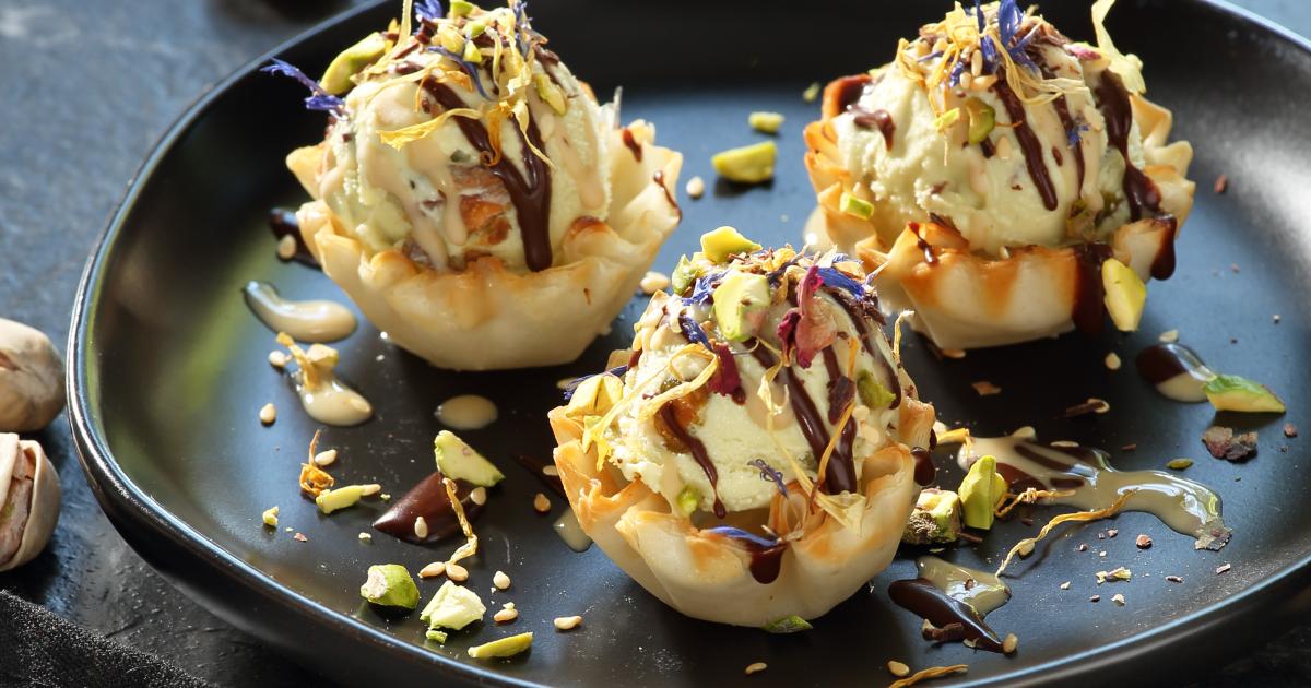- Divide small scoops of ice cream evenly between phyllo shells.