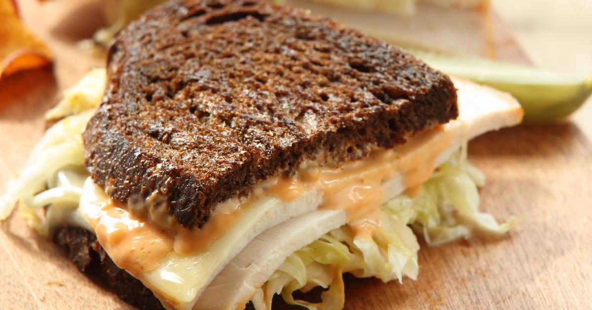 - Place ½ of the bread slices on the preheated skillet, buttered side down. Spread the top of these slices with ½ of the dressing; top each slice evenly with cheese, turkey and sauerkraut.
